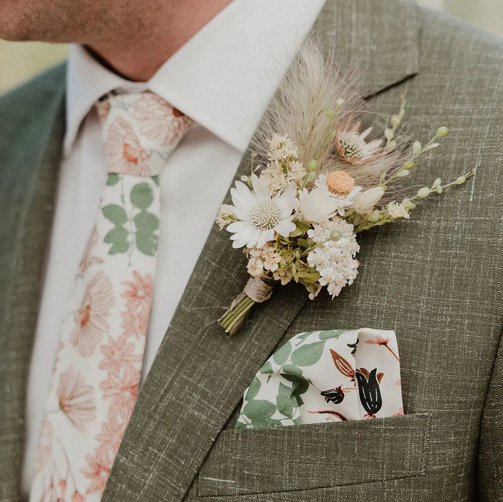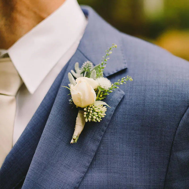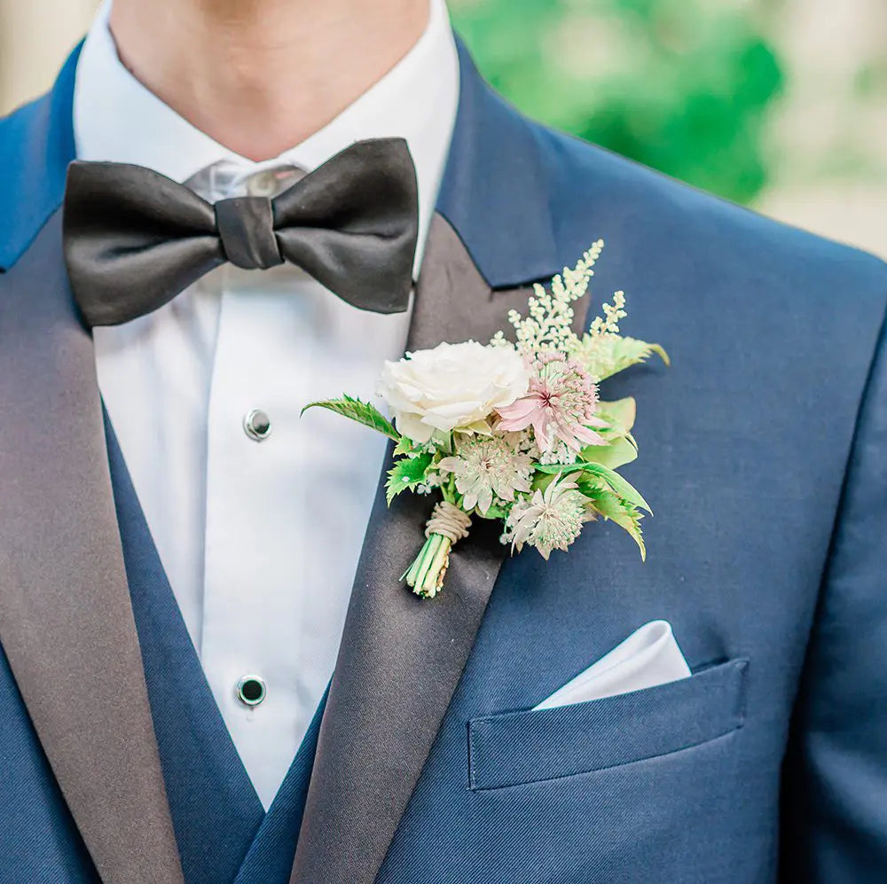 Wrapped in waxed twine and/or ribbon, these miniature, wearable bouquets pin on or have a magnet for attaching to a shirt or coat for weddings or school dances. They usually contain a focal flower, several small supporting flowers, and few pieces of foliage.