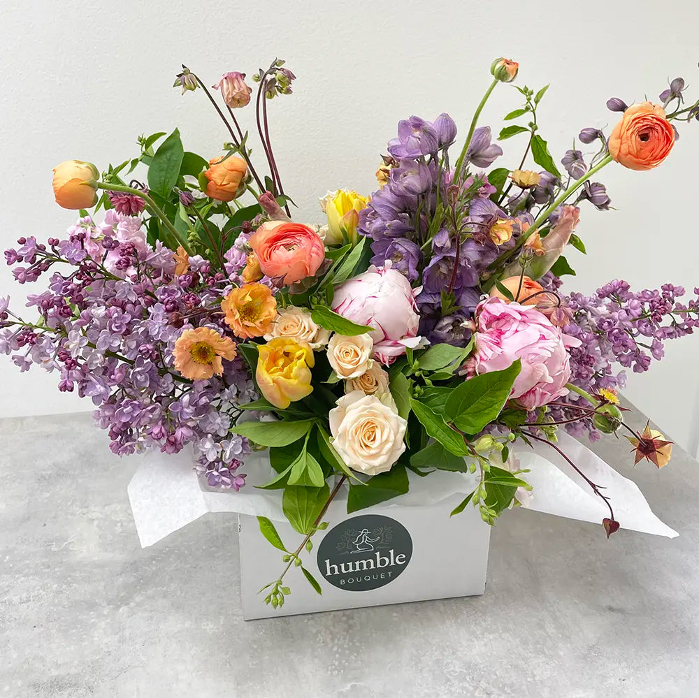 The crowning queen of florals, the Compote features a free and loose gathering of blooms and foliage to create a delightful, asymmetrical profusion of color. A “compote” vase is a pedestal vessel that can host an abundance of flowers often arranged in an oval shape, perfect for a large centerpiece on a table. Each Compote is uniquely created from the blooms and foliage available in the garden: you choose the color scheme and bouquet card message, and I deliver a one-of-a-kind vibrant creation to your loved one, or to you.
