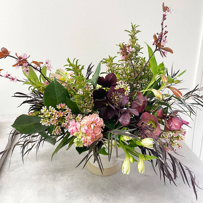 wintery floral arrangement with seasonal flowers for Valentines Day