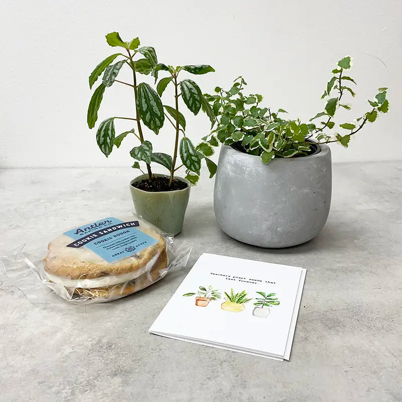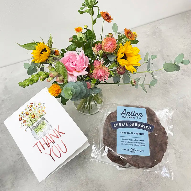 Choose a buttercream sandwich cookie from Antler Baking Co. & a greeting card from Marigold Tales along with a collection small of house plants or a small arrangement from Humble Bouquet collared in a small box with tissue paper and delivered to your loved one.