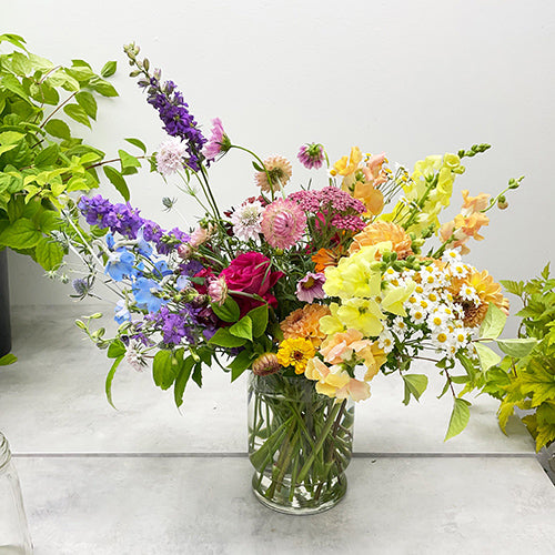 Late summer and fall bouquets may have dahlias, snapdragons, pincushion flowers, rudbeckia, garden roses, cosmos, zinnias, delphinium, phlox, sunflowers, lisianthus, yarrow, feverfew, asters, heirloom chrysanthemums, rose hips, autumn perennials, textural ornamental grasses and grains, and fall-tinged foliage.
