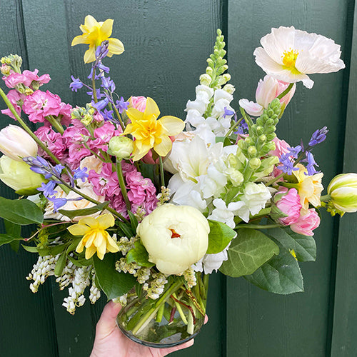The lush Garden Display is a loose and casual gathering of fresh blooms and comes in a glass cylindrical vase and is about 14" tall and wide.