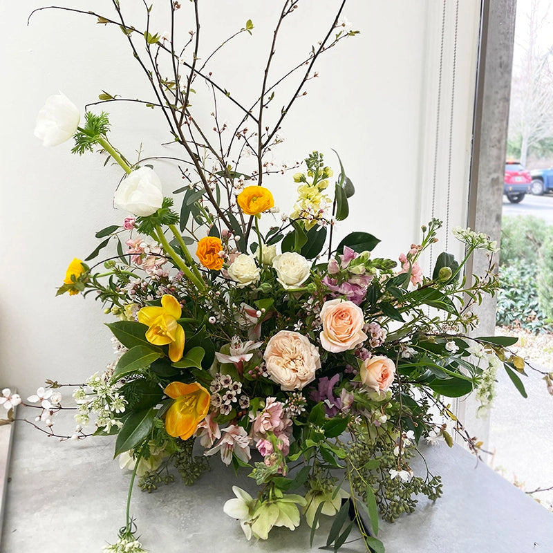 These extra large and lush arrangements are custom works of art made particularly to each occasion. In the order notes, you can make requests for a few specific flowers from the list below or other seasonal flowers, specific colors other than the options below, and personalize a message for the card. I will create and deliver a one-of-a-kind, seasonal floral creation to you or your loved one based on your wishes. Vessel shape and type will depend on the season, colors, and flower types used.