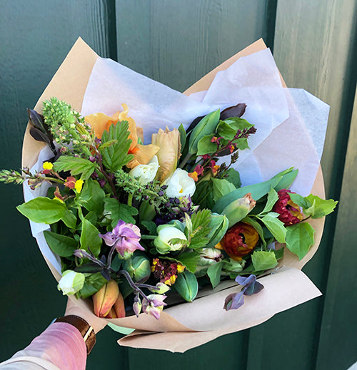Simply bursting with colorful blooms, the Wrapped Bouquet is definitely not your average grocery store posy draped in baby’s breath and wrapped in plastic. These stems sit in a compostable bag and are wrapped in brown paper and white tissue paper.