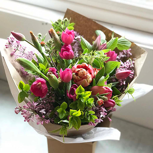This product is only available in a “gardener’s choice” colors palette to give me the freedom to select loveliest blooms and complimentary colors available. Please choose a card message, and include a personalized note in "delivery instructions" on the cart page if sending flowers to someone directly. Please choose a color palette and include a personalized note for the small card that will be included. Delivery fees start at $10. Please select the corresponding delivery charge to the area in the check-out process.