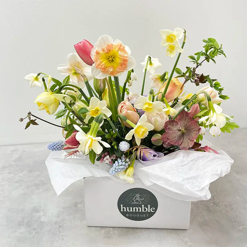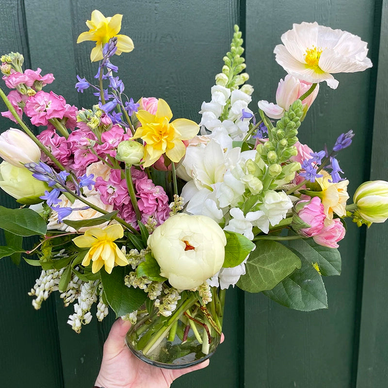 Winter arrangements have a PNW feel to them with West Coast-grown flowers and foliage. The may include: amaryllis, chrysanthemums, spray roses, snapdragons, hellebore, pincushion flowers, wax flower, freesia, stock, tulips, lilies, heather, ferns, evergreens, box, eucalyptus, and other greenery, etc.