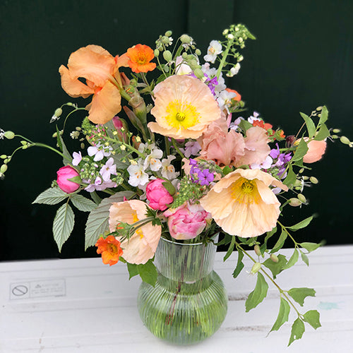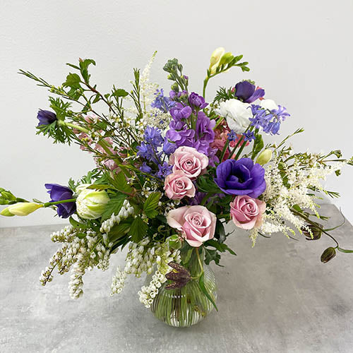 This airy arrangement in a glass vase is a loose and casual gathering of seasonal wildflower-like blooms.