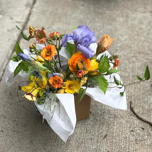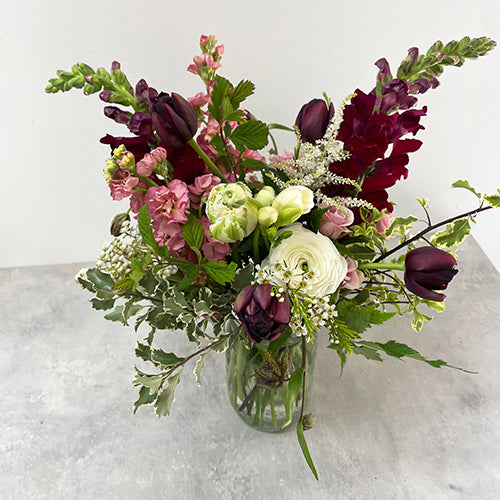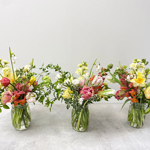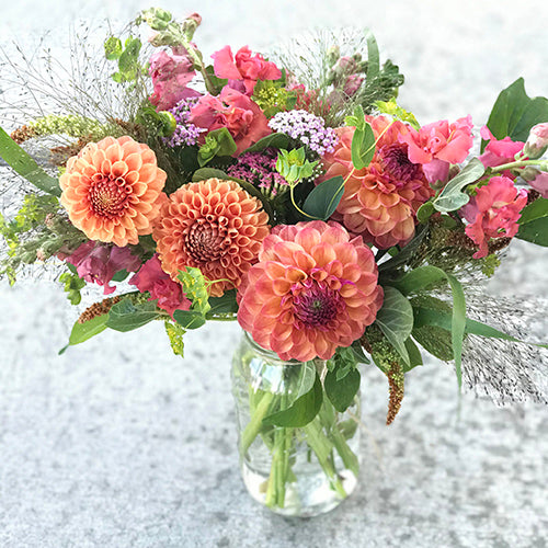 A mason jar: the perfect casual container for so many things. In this case, the stems of brilliant blooms bursting upward in a classic bouquet style with seasonal foliage. You choose the color scheme and size of this sweet bouquet. What a simple but gorgeous way to show you care.