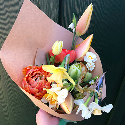 The flowers and foliage that make up each delivery vary based on the seasons. Spring bouquets and arrangements are brimming with tulips, fragrant daffodils, anemones, ranunculus, spring flowering branches, peonies, sweet peas, and various spring foliage. Summer bouquets and arrangements are reminiscent of wild flowers full of bright posies with roses, nigella, cosmos, larkspur, zinnias, sunflowers, snapdragons, summer-blooming vines and perennials, and scented herbal foliage. Autumn bouquets highlight the sumptuous textures of heirloom chrysanthemums, amaranth, dahlias, branches of berries, fall-tinged foliage, dried flowers and seed pods.