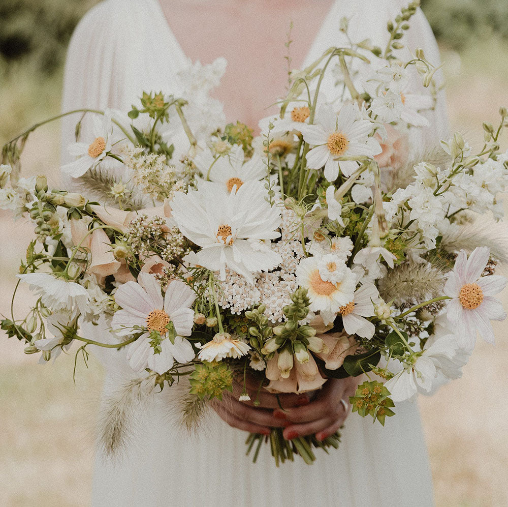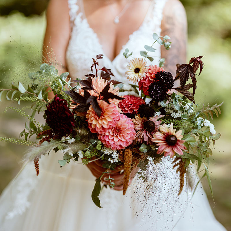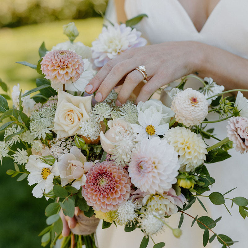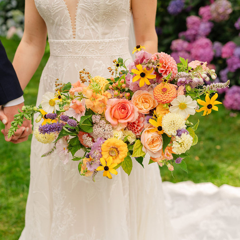 Seasonally-inspired, using as local as possible fresh flowers, wrapped with a coordinating ribbon around the stems. These bouquets are designed with a loose, organic, and whimsical style. Please communicate any style, particular flowers, or color preferences in the order notes. Wedding bouquets come in a cylindrical glass vase with a few inches of water to keep the flowers hydrated until it is time for the ceremony.