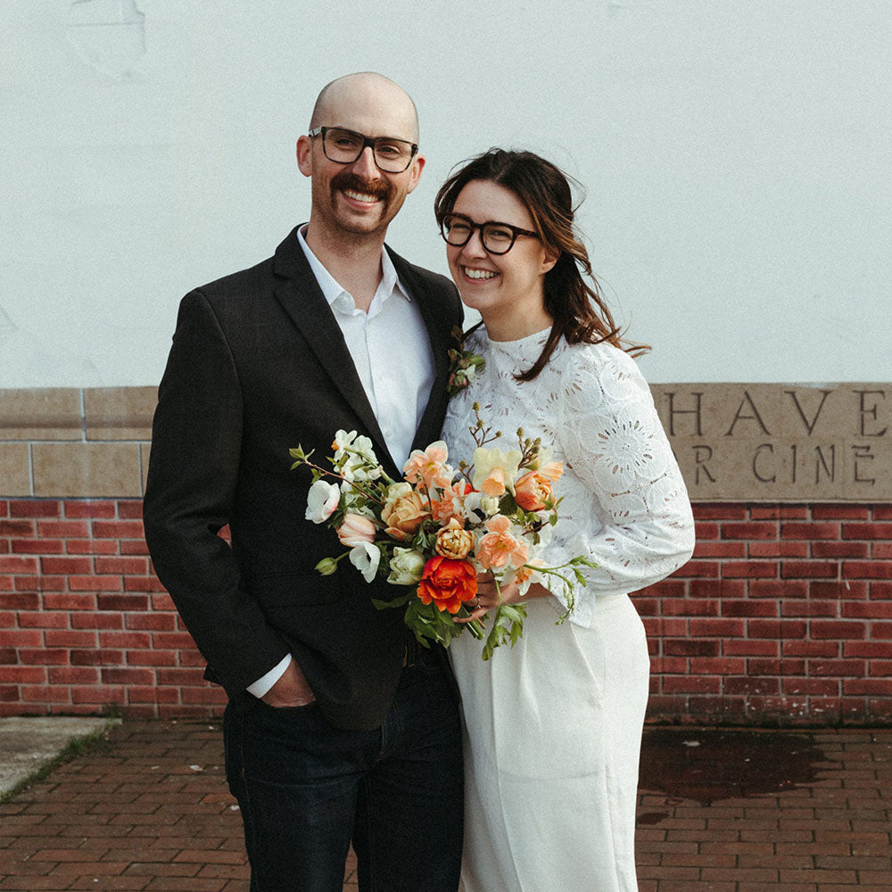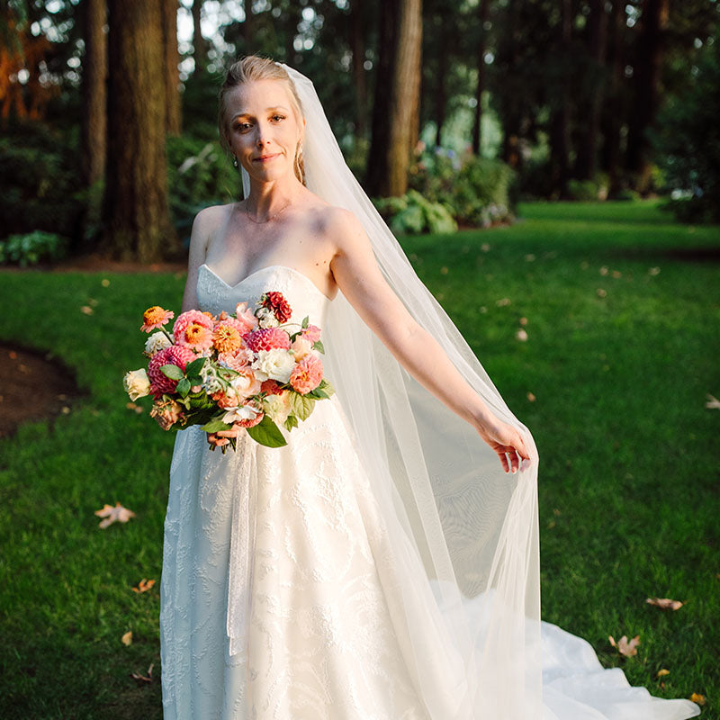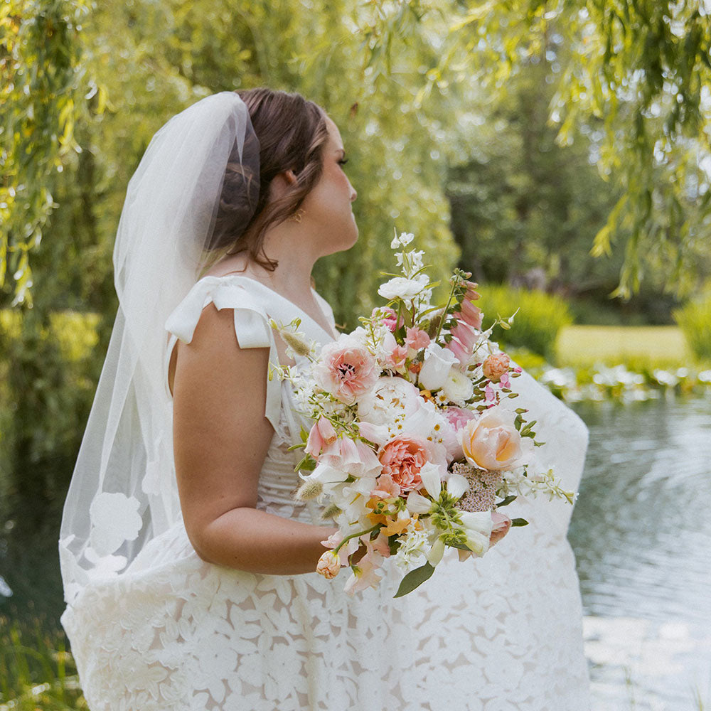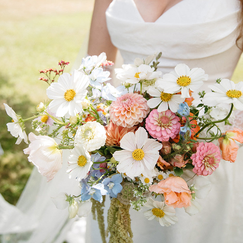 Seasonally-inspired, using as local as possible fresh flowers, wrapped with a coordinating ribbon around the stems. These bouquets are designed with a loose, organic, and whimsical style. Please communicate any style, particular flowers, or color preferences in the order notes. Wedding bouquets come in a cylindrical glass vase with a few inches of water to keep the flowers hydrated until it is time for the ceremony.